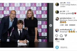 达米安-切赫社媒晒出与富勒姆的签约照片,他的父母出席签约仪式,达米安-切赫配文:“永远感恩。”